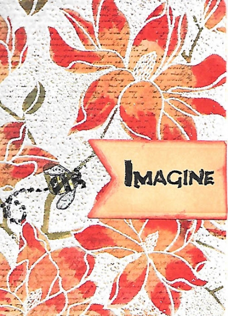 I stamped the text stamp on the background first, then I stamped with a background stamp in versamark and embossed with white embossing powder. After I heated it I painted the flowers with distress ink in different colors. I stamped the bee and trail with stazon ink and then colored it in with Faber Castell Artist pens. I added the imagine saying on a flag and called it a day.