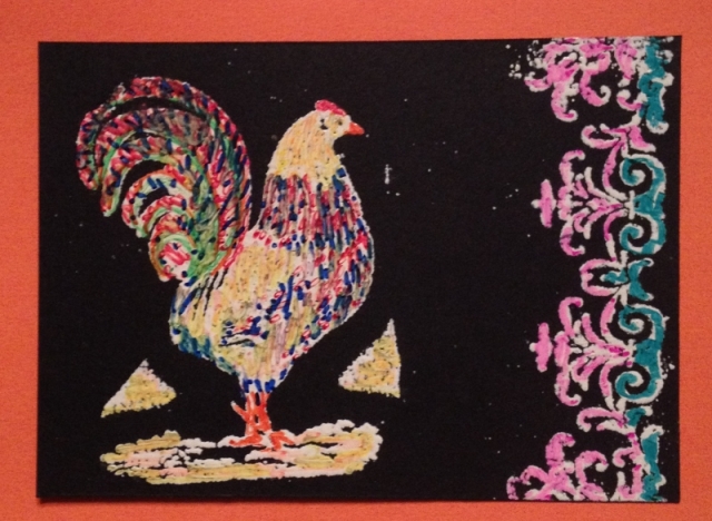 She is definately a festive chicken. Love the bright colors. And the flourish along the side is really cool.
