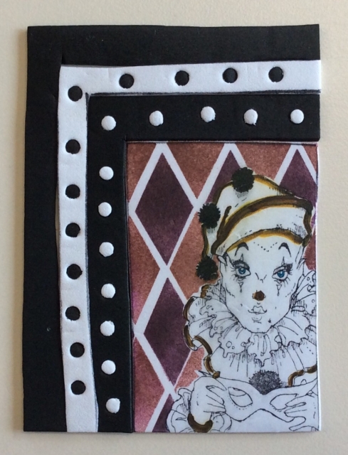 I used black & white craft foam for this. the lower left part started out as a full size ATC. I used the same stamp, stencil & inks, then heat shrunk the piece. The black & white border is shrunk foam & all parts were attached to the sticky face of a large label.