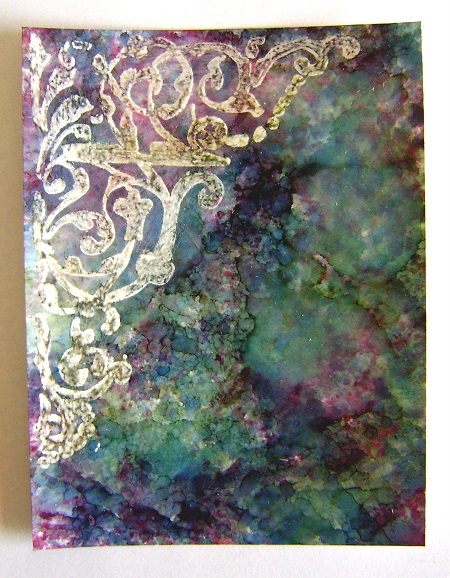 This technique is really neat I think. I used clear embossing powder on the stamped image, inked the glossy cs with alcohol inks and wiped off the excess ink on the image. You REALLY have to wipe hard! I don't think I could do many at a time because of that. It looks neat though.