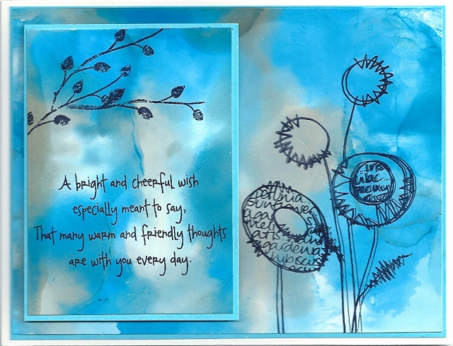 For the monoprinting challenge with alcohol inks I used glossy cardstock and sailboat blue, meadow, and slate alcohol inks and a piece of plasticy stuff a stamp set came in. I put the alcohol ink down on the plastic and added some BF and then placed the glossy cardstock on top and closed the plastic over the top and then ironed with my hand. I did a regular size piece and a small piece for the sentiment. The flower stamp is Paper Artsy. The sentiment and branch is Technique Tuesday.