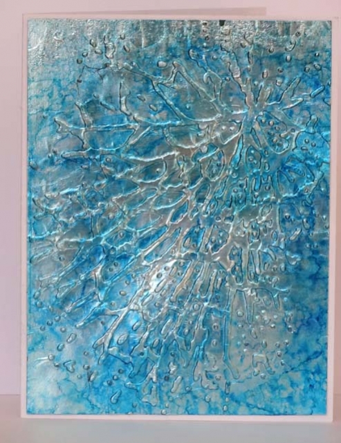 Cracked Ice. This is one of my favorite alcohol ink techniques.  Glue foil to a A2 piece of cardstock.  Dry emboss. Color with alcohol inks. Here I removed the embossed top surface with BF on applicator to create more of a feel of cracked ice.