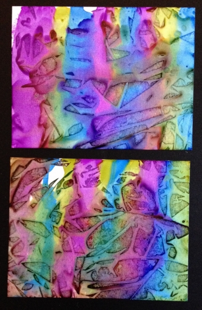 This is my entry for Week 2, Challenge 6. I chose the saran wrap technique. I held my yupo paper (nonporous, 100% polypropylene) vertically and dripped alcohol inks in vertical stripes. I had paper towel underneath to catch the puddles. The top sample I dripped ink and then laid it down flat without moving the paper too much. In the bottom sample I tilted the paper around more to blend the stripes. I crumpled saran wrap and smooshed it on to both pieces and left overnight to dry (the hard part was leaving it alone!).