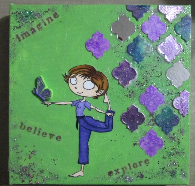 The alcohol ink pieces are some of the die cuts. The really purple ones were created by inking acetate and attaching that to light purple cardstock. There are a couple that are really shiny and the two by the image were created by attaching tin foil to comic book board and inking the tin foil. The silver die cut pieces were cut from mirror paper. And the purple/blue/green pieces is paper towel attached to comic book board (I used the frame piece on the jogger card). I attached the pieces by coating the canvas with heavy gel medium and sticking the pieces in. I got the idea from Anna-Karin's blog. I added micro beads and glitter.
