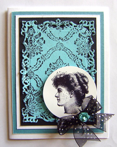 How elegant! I also like this color combo and the delicate stamp that is die cut! Very pretty overall! Thanks for doing my challenge!