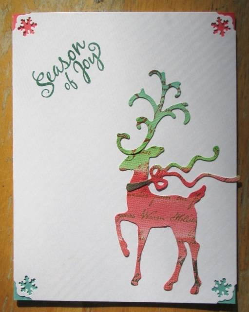 I used the reindeer created when I did the warm-up challenge. Keeping it simple, I used a corner punch and then inked the corners of the card base. I glued on the reindeer and then stamped a sentiment by Fiskar. The white base looks textured in the picture but I think that is because I photoed it on my screened in porch. It is just plain cardstock.