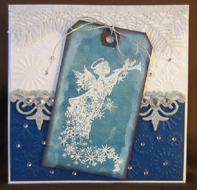 Angel was stamped and heat embossed onto tag and then mounted on two shades of card that were embossed with a snowflake design. The cut edges of the card colours were hidden with snippets from a silver border (K and Co methinks).