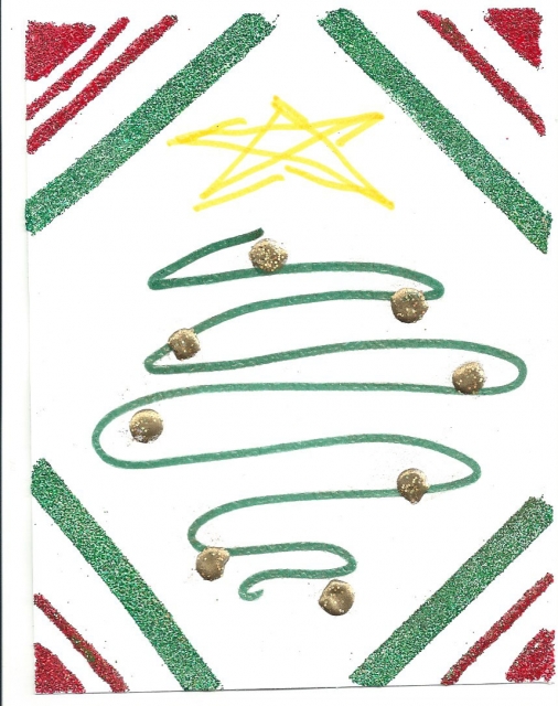 The red is done with a zig glue pen, the green is ATG tape. The gold dotted ornaments are done using small zots glue dots. The green swirls are done using an embossing marker as is the gold star.