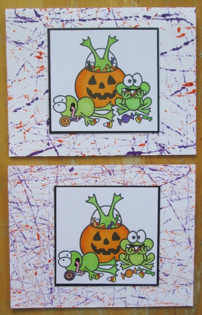 Here are the cards I made with my marble roll backgrounds. I used ColorBox pigment ink reinkers in orange and purple. I did the orange first. The image is by Pink Cat Studio and they were sitting in my stash colored and ready to go since last Halloween. I colored them with Copics and Spica markers.