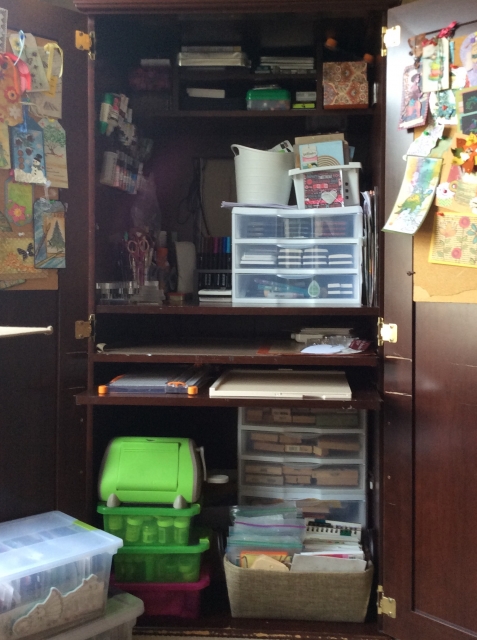 Honestly, my craft area rarely looks any better than this, of course, unless you just close the doors of the cabinet. I included two of the three extra bins of stamps on the floor on the left since those are all nicely put away right now.