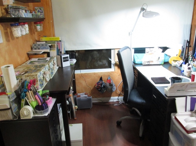 Here is a picture of my crafting corner. It shows my crafting desk and the table behind it. And you can kinda see my big shot in the bottom right corner.