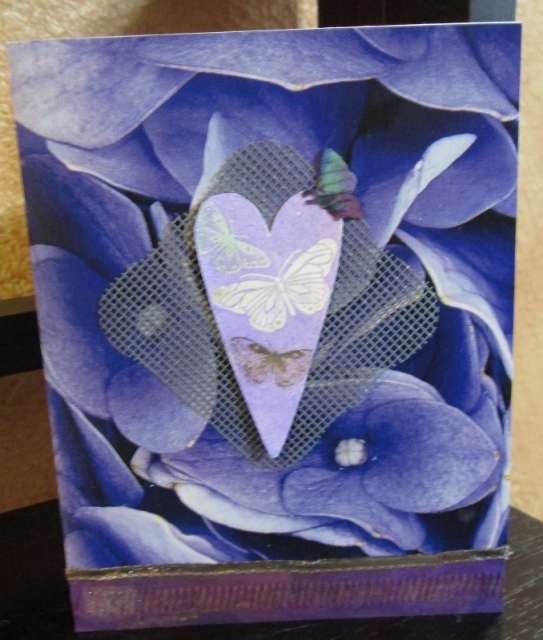 The piece at the bottom is part of a coffee filter. I colored it with Distress Ink in Wilted Violet. And I rubbed some gold gelato on top. The ribbon was actually saved from the trash. It was one of the ribbon loops in either a blouse or dress for holding it on a hanger. I hate those things, so I cut them out. The top piece is the side of a tissue box. I die cut a piece of screen. The heart was stamped on an invitation to an alumni dinner from my law school. It was on a lovely cream cardstock. I stamped with colorbox ink and embossed with clear embossing powder. I then used metallic watercolors to color the butterflies. The stamp is by Penny Black. The punched butterfly was cut from a spare bit of coffee filter.