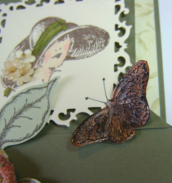 Here is the close up of my pressed images. I used copper colored embossing paste and swiped some on heavy watercolor paper. I pressed my butterfly stamp in the paste. After it dried I rubbed on some black Staz On ink to bring out the impression better. I fussy cut the image to add to the card.