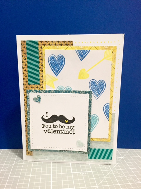 I needed some non girly ones! Stamps are all from the dollar bins, studio g brand. The hearts and arrows were stamped in pigment inks from Avery Elle, colorbox and the royal blue is from ranger. The papers are MME and authentique. I added a strip of the striped washi because I didn't see the red smudgy distressing the yellow paper had in a couple of corners! Hearts were from a MS punch. TFL :)