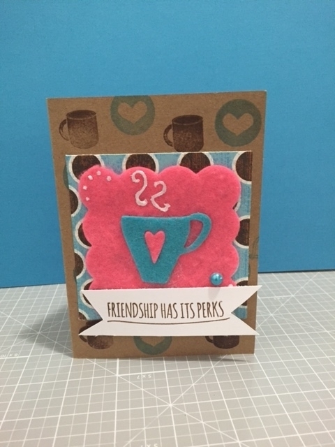 I used a spellbinders die to cut the scalloped shapes from felt and ran it through 4 times to make sure it cut well. I cut the coffee mug(SSS) from the same felt and pieced the heart in. Stamped the cardbase with some coffee themed stamps from SSS. The die and stamp set were from a kit they once had. It doesn't show in the pic but the felt piece is a gift card holder. I also added some liquid pearls to the top for steam and a small flat back pearl to the piece. PP is from an ancient DCWV pets stack. TFL :)