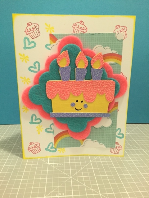 Same as my last, cut the felt with spellbinders dies. The cake piece is something I cut with the Cricut. The cardbase is stamped with with small images from a couple of hero arts sets. I used SSS hot lips ink, hero arts pool ink and some colorbox canary yellow ink. PP is from doodlebug I think! Card is A2 sized TFL :)