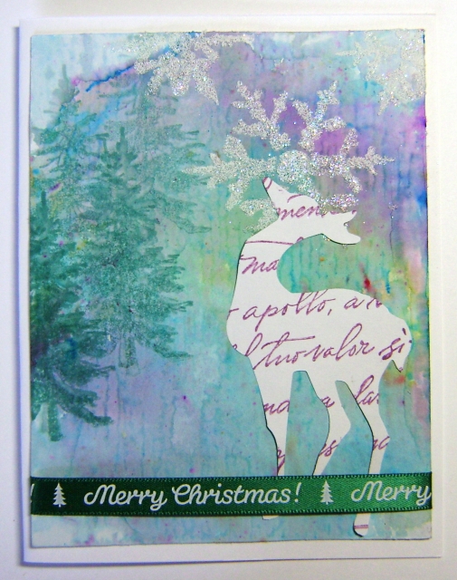 I used watercolor paper and color bursts for my background. I stamped trees on the left. I used a snowflake stencil at the top with translucent paste and white glitter. The deer is a die cut from white paper and stamped with a script stamp.