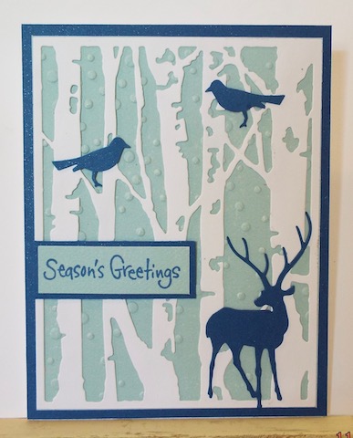 I was taken by this color combination I saw on Pinterest for this card. Tree die cut (Sizzix ), Deer (I.O.), E.F. (Tailored Expressions). Stamped image (Stampendous) in blue ink. TFL