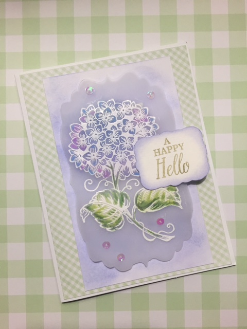 This theme was to create a card that had a light and airy feel to it. With Jan's suggested prompts, I heat embossed my image(rubber stampede) on to some clear vellum with so,e recollections EP in white. Colored parts of the flower with colored pencils. I used my cricut to diecut the image. Next I ink blended some shaded lilac distress ink on to some white card stock. Mounted the focal image on to that with some foam. Added my sentiment and some sequins to a gingham pattern paper(hobby lobby paper studio). Sentiment is from Hero Arts. TFL :)