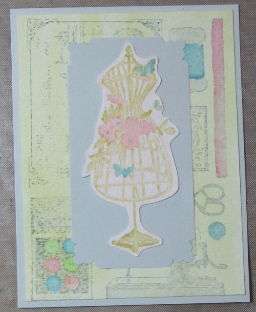 I started by inking a piece of watercolor paper with DI in Spun Sugar. I stamped the dress maker's dummy with DI in shabby shutters. I used my waterbrush to soften the edges and added some color with the koi watercolors. I used a corner punch on the piece and messed up one of the corners. So I ended up cutting it out and mounting it on the grey card stock. It took me 3 tries to get the corners punched properly.