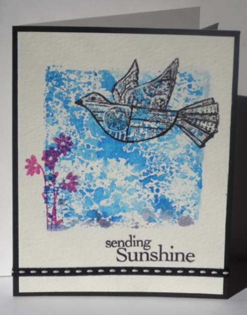 I started this card with ink smooshed on acrylic block, misted and stamped on watercolor paper. I selected this card because I thought I had the same bird stamp…only to learn I did not buy that one. How did I miss that great bird stamp??? The stamp I used here is from a TH rubber stamp set. I stamped with black archival ink and stamped the Hero Arts flower with raspberry ink. Hand colored the bird with white ink pen and black micron pen to add interest and so it would stand out from the background. Added sentiment and ribbon.