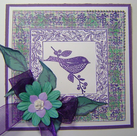 I had fun using an very old Magenta frame stamp that had several frames in one on it. I stamped the frames stamp twice, once on pp which is the outside frame and once on white cs which is the inside frame. I used purple embossing powder on both frames. The leaves on the outer frame were colored with a green colored pencil to bring them out a bit. The Inkadinkado bird was also embossed with purple ep. The leaves were stamped on green cs using leaf stamps from Heartfelt Creations and fussy cut.