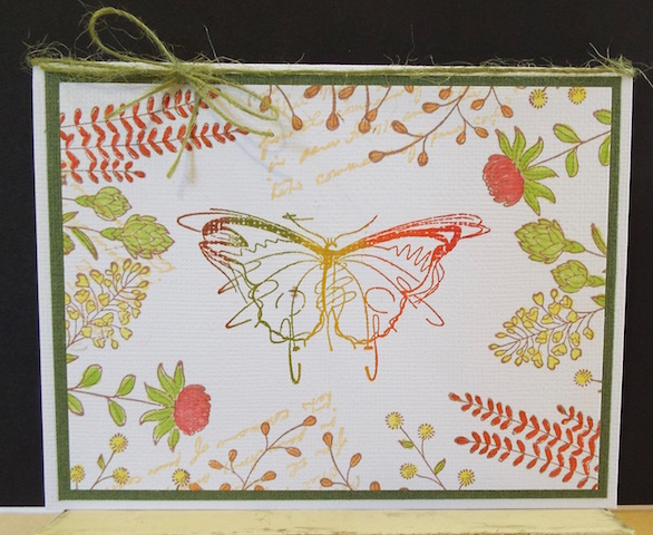 I created a frame of flowers around a butterfly image. Stamped butterfly image (Ross Anderson - The Write Impression) with Kaleidacolor Tomato Vine Ink. Stamped flower images (Stamping' Up) with Versafine Vintage Sepia Ink. Colored images with copics. Also stamped a scrip (Limited Eddition) to hide some marks from the edges of some of the images, using a very pale chalk ink (Fresco). Matted to green mat, then white card base. Added green twine to top. I stamped the images to white textured paper. TFL