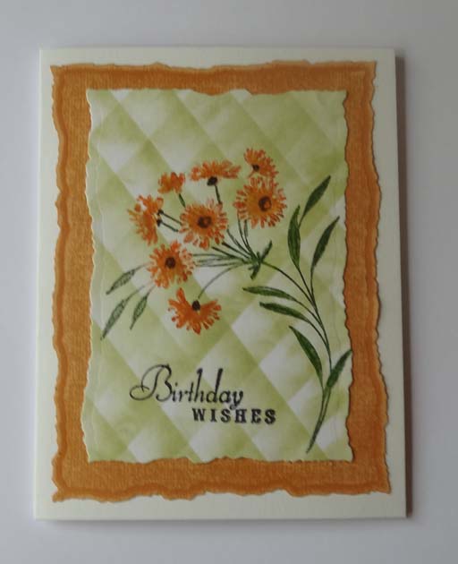 I used Tombow markers for stamping this Penny Black flower directly on top of my background...after testing on one of my many trashed backgrounds. Die cut the layered frames and sanded the orange core'dinations distress paper.