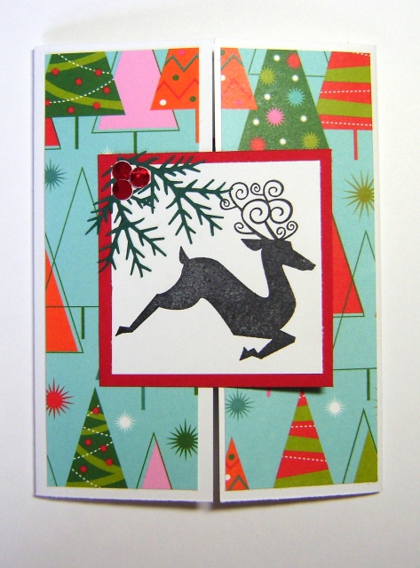 Here is my second Holiday card in July. It looks like I have a deer theme going! I used patterned paper for each panel. I love this deer and use him a lot. he was stamped with black ink on the white panel and adhered to a red panel. The fir sprig is a punch. I punched the berries from red glossy card stock.