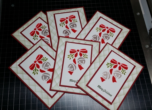 Winter Holiday Cards in July--Christmas--Darice Bells & Bow Stencil with Pillow-Top Background