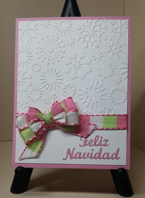 I copied a card I saw at Mainely Stamping in Fairfield, CA. The original card had a stamped Merry Christmas sentiment, and it was a one layer card. It looked great; however, I ended up using die-cut sentiments and putting my one layer on a card base. I usually feel better when something is matted, and I wanted to pick up on the pink in the ribbon. I made three Merry Christmas cards, and one Feliz Navidad. The others are posted in my gallery at Scrapbook.com, but they are all alike.