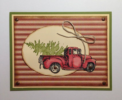 I love my truck old fashion truck stamp! I stamped the tree on the oval first and fussy cut the truck to fit over it. The tree and truck are water colored.