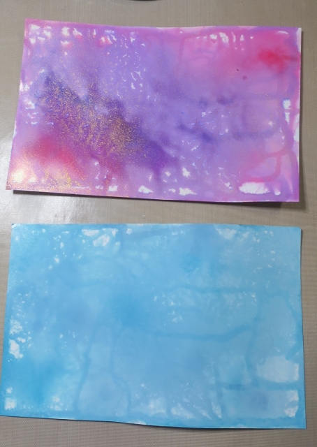 The bottom one is the second one I did. I used Distress Reinker in Tumbled Ink, Stormy Sky, and Peacock Feathers. I didn't have any spray bottles to turn the reinker in to sprays, so I sprayed the paper, dropped some ink and sprayed with water again to get it moving. I used silver shimmer mists. I'm not real happy with this one since the colors blended too much and the shimmer disappeared.