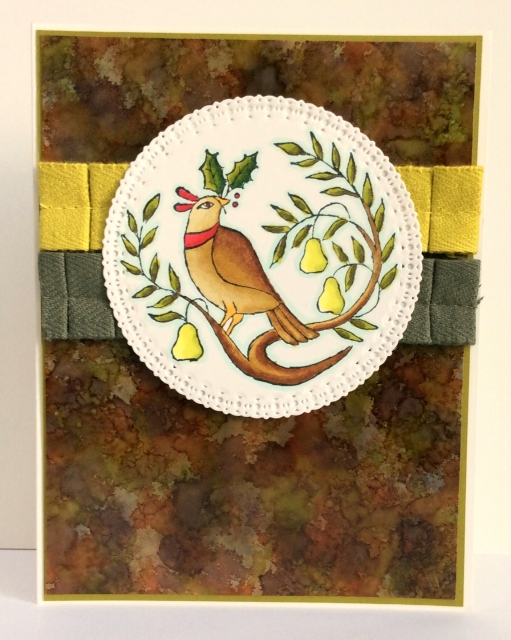 I used the fall looking polished stone background for a Christmas card. I was goingn to use the green one, but after I colored my image with alcohol markers, it just looked better on this one. The ribbons came pleated like that.