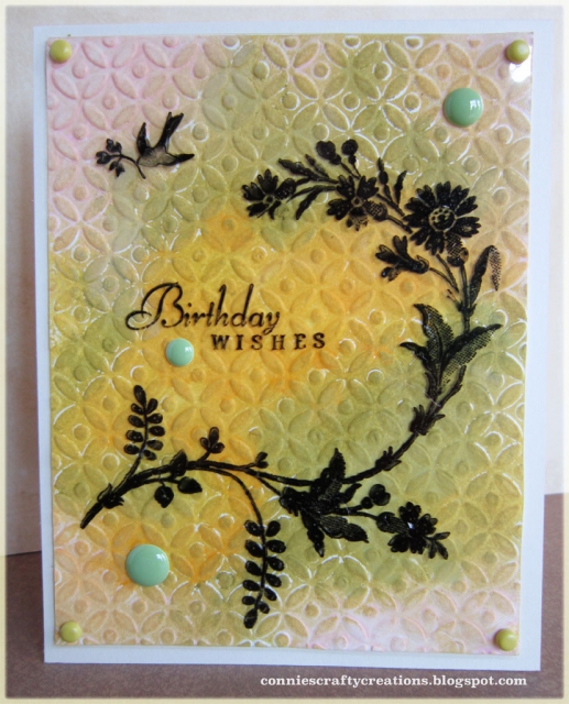 Really pretty card. I like the embossing just as it is (not sanded). You can still see it behind the stamping. I like the enamel dots too.