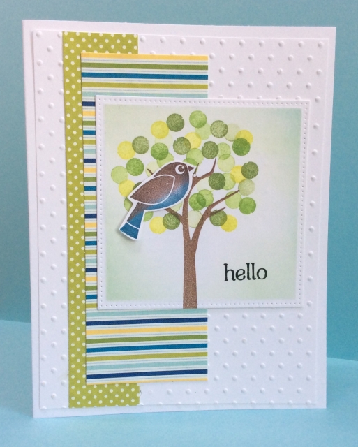 This was super fun and easy! I may just have to do more of these! I decided on a spring card by stamping my tree trunk (Gina K Autumn Blessings) ink brown and then using 3 colors of Avery Elle pigment inks for the leaves, and I used generation stamping, which I think added a lot.