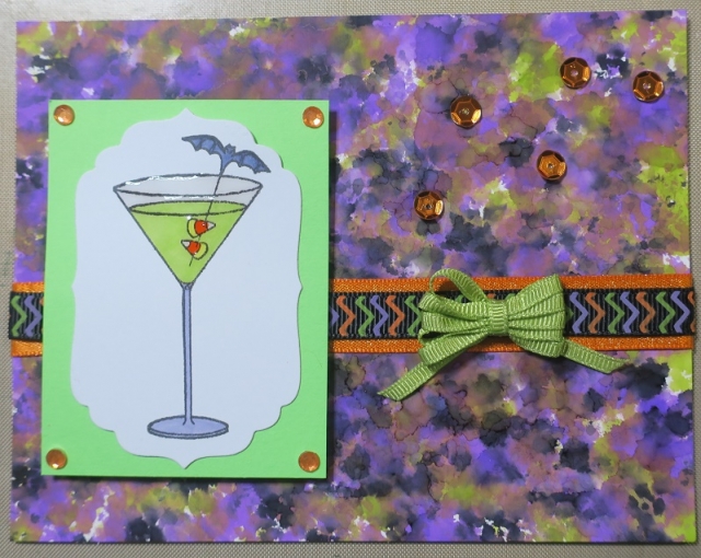 Here is one of the cards I made using my Halloween polished stone background. The image is by Impression Obsession and I colored it with Copics. I added glossy accents on the glass. I layered two different ribbons and made the bow using my bow-it-all.