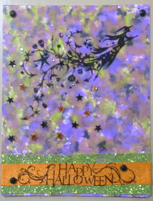 I used the other half of my Halloween polished stone background for this card. I stamped the witch and sentiment on the acetate. But the sentiment was blending into the background, so I added the ribbon behind the acetate. And the orange ribbon wasn't wide enough, so I added the green. Then I added gems and sequins. The stamps are by Inkadinkado