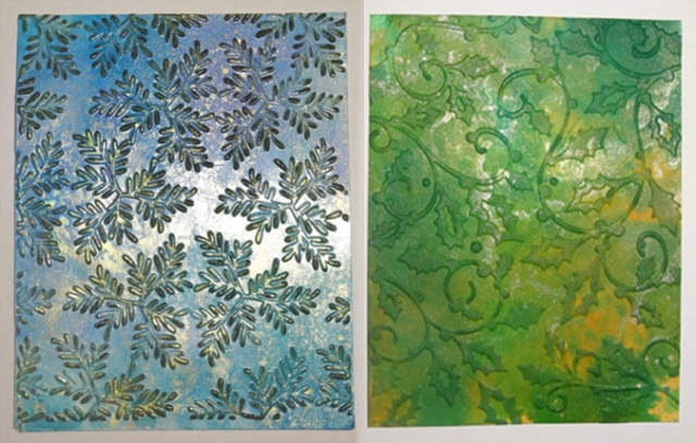 I have worked with a few of my sprayed backgrounds to prepare for card marking. The evergreens on the left are dry embossed and swiped with green archival ink (sorry for the glare on the glossy cardstock). The 2nd background on the right was from cleaning up the over spray onto plain paper. I swiped a lighter green ink on this one. I plan to add additional layers on both of these.