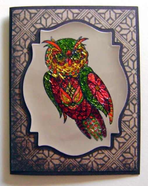 I have had so much fun with this. I just love the results of the foil behind the image. This owl is from Just For Fun stamps. I used tan acrylic paint around the owl and colored the owl with sharpie markers.