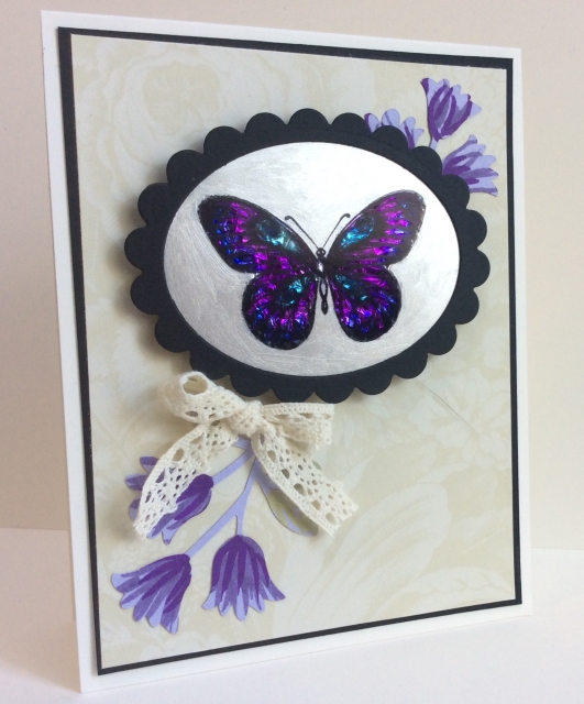I followed Craft Nerds instructions for this. I decided to go with a stamp with wider lines as I thought this showed up better when over the foil. It does look prettier in person. I used Iridescent Pearl paint as that is what I have.