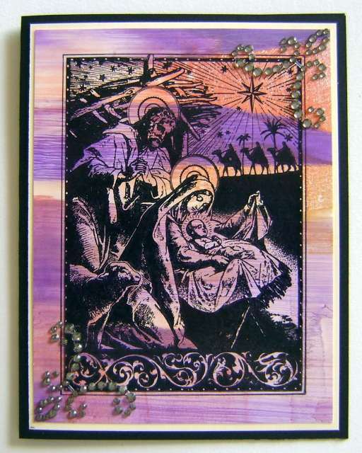 I used an old background I made on glossy cs. I swiped colors on the glossy cs and stamped over it with the nativity stamp. I added rhinestone corners to the card.