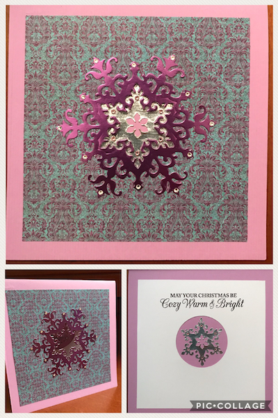 Still playing with my snowflake dies. I cut the middle of this one through to the inside of the card, so the silver snowflake is on the inside but it shows through the opening to the outside. This card is 6x6 inches square.