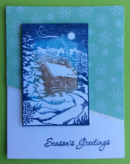 I used multiple inkpads to ink up the stamp and stickles glitter glue on the hill. Stamp is Inkadinkado and greeting Hero Arts.