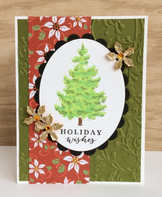 For this card, I was going for a rich, traditional look. I used the Hero Arts Layering tree stamp and some glitter glue. The paper was a freebie from a magazine (I like it so I have been hoarding it!) and the embossing folder is Sizzix.