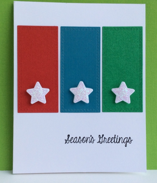 I used dies to make this card with an idea from Pinterest. It was fun and easy and adds one to the stash! Dies are XStitched from Gina Marie and Darice stars. I popped up some white stars and then added glitter to them.