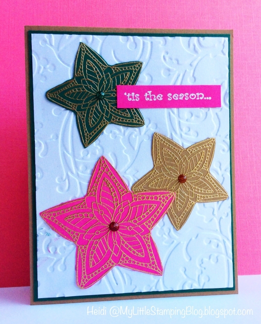 Supplies: Just for Fun Rubber stamps Stamptangle Stars, large and small, Versamark Ink, Recollections Detail Gold embossing powder, Sizzix Swirl Embossing folder, Kraft and Lumiere papers from my stash, Gina K Passionate Pink and Christmas Pine cardstocks, Nuvo Crystal drops in Ruby Slippers, Emerald City and Golden Sunset.