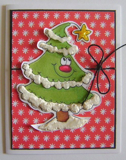 Oh my, I just love this drawing by our very own Daniel! I do hope this gets to be a stamp! I had fun coloring the tree with my Spectrum Noir alcohol mrkers. I used white Liquid Applique for the snow and stickles also on the snow and the star. It was fussy cut and pop dotted to the card.