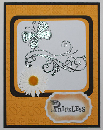My butterfly and flourish were heat embossed with black embossing powder and I embossed my background.