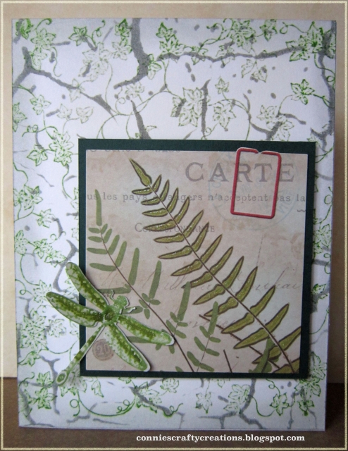 Love this pretty, botanical card. Wonderful combination of stamp and stencil with that printed paper. Very cool dragonfly!